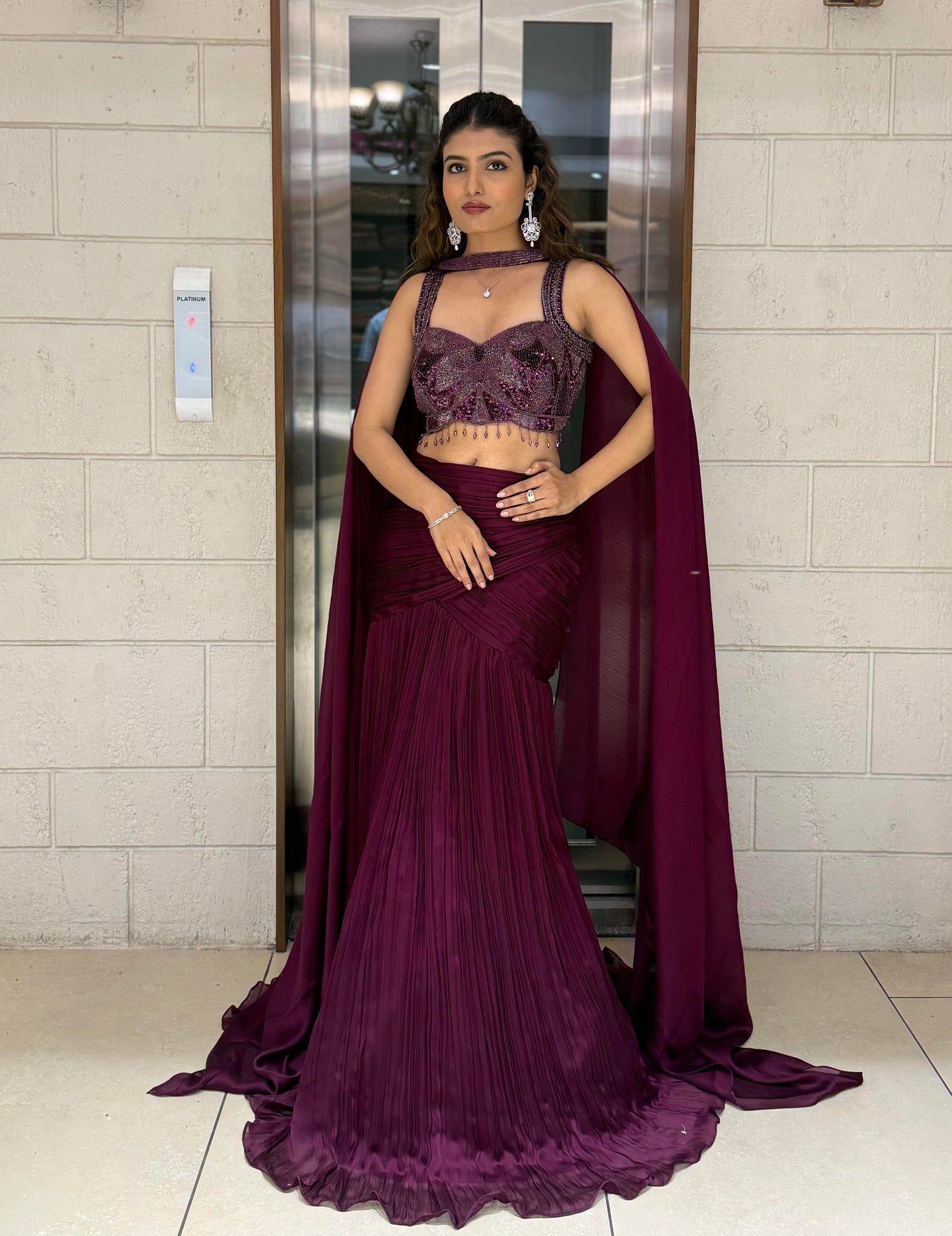 Wine Purple Designer Mermaid Gown with Draped Cape & Crystal Hand Embroidery