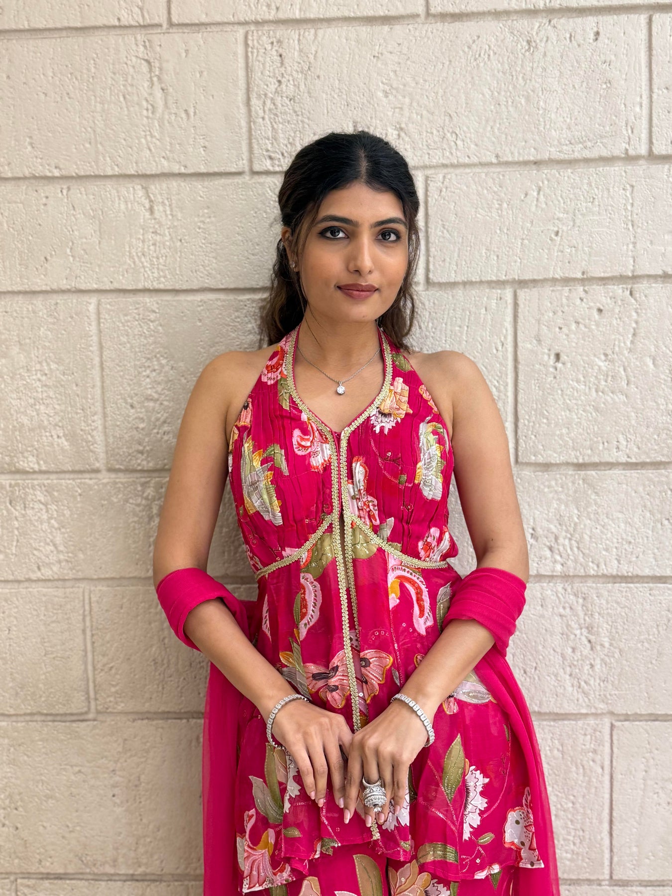Step into elegance with this stunning Designer Fuchsia Peplum & Palazzo Set with Multicolor Floral, crafted for women who love vibrant colors and graceful silhouettes. Made with breathable georgette, the outfit features a beautifully embroidered halter-neck peplum top paired with wide, flowy palazzo pants that offer unmatched comfort with a festive flair.