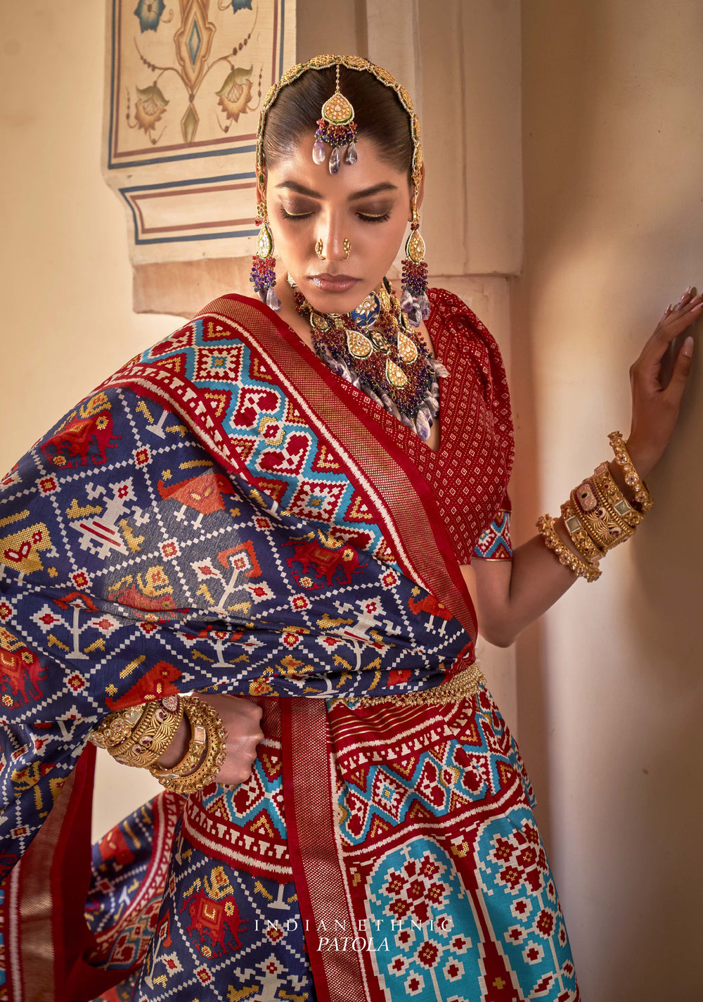 This exquisite Grey and Red Patola Silk Saree is a stunning example of timeless Indian artistry, crafted using the traditional double ikat weaving technique that defines the heritage of Patola textiles. The saree showcases a sophisticated interplay of soft grey and rich red tones, accentuated by intricate geometric and folk-inspired motifs that narrate cultural stories through their patterns. The deep red border and pallu are richly detailed with fine woven designs, adding a striking contrast and elevating the saree’s overall regal appeal.