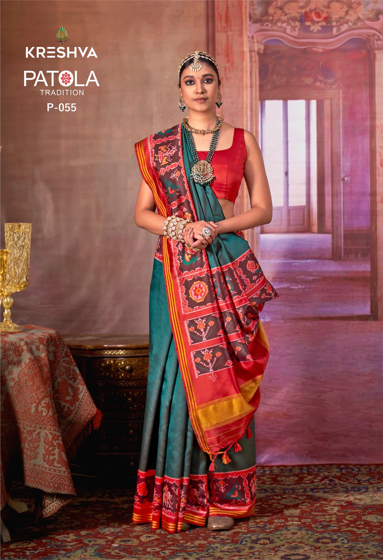 Teal Green & Red Traditional Patola Soft Silk Saree with Intricate Ikat Pallu