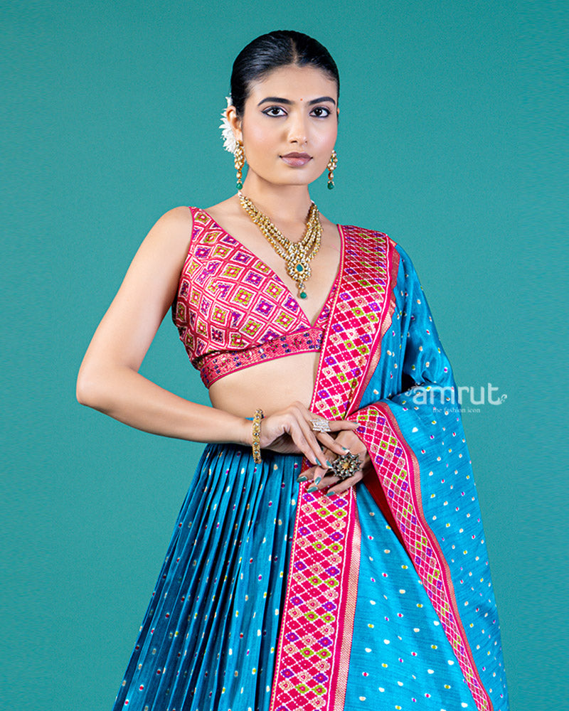 This lehenga choli set features a blue lehenga with intricate pink, gold, and purple patterned borders on the pleated, flared lehenga. The borders are also prominently featured on the matching dupatta, creating a cohesive look. A V-neck pink blouse with a similar pattern completes the ensemble with elegant flair.