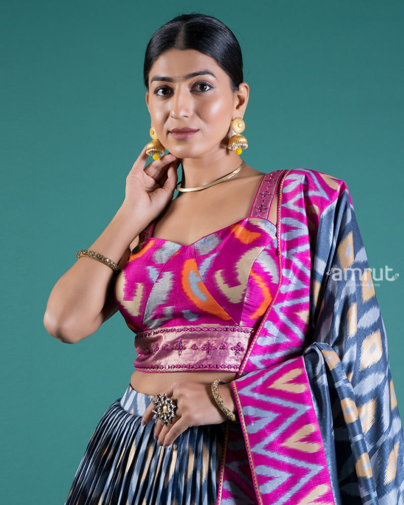 Vibrant Pink & Purple and Grey Ikat Lehenga Choli and Dupatta