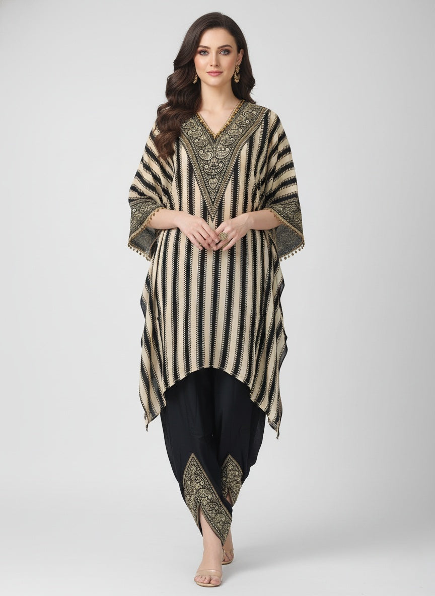 Black & Ivory Striped Embellished Kaftan Kurta with Dhoti Pants