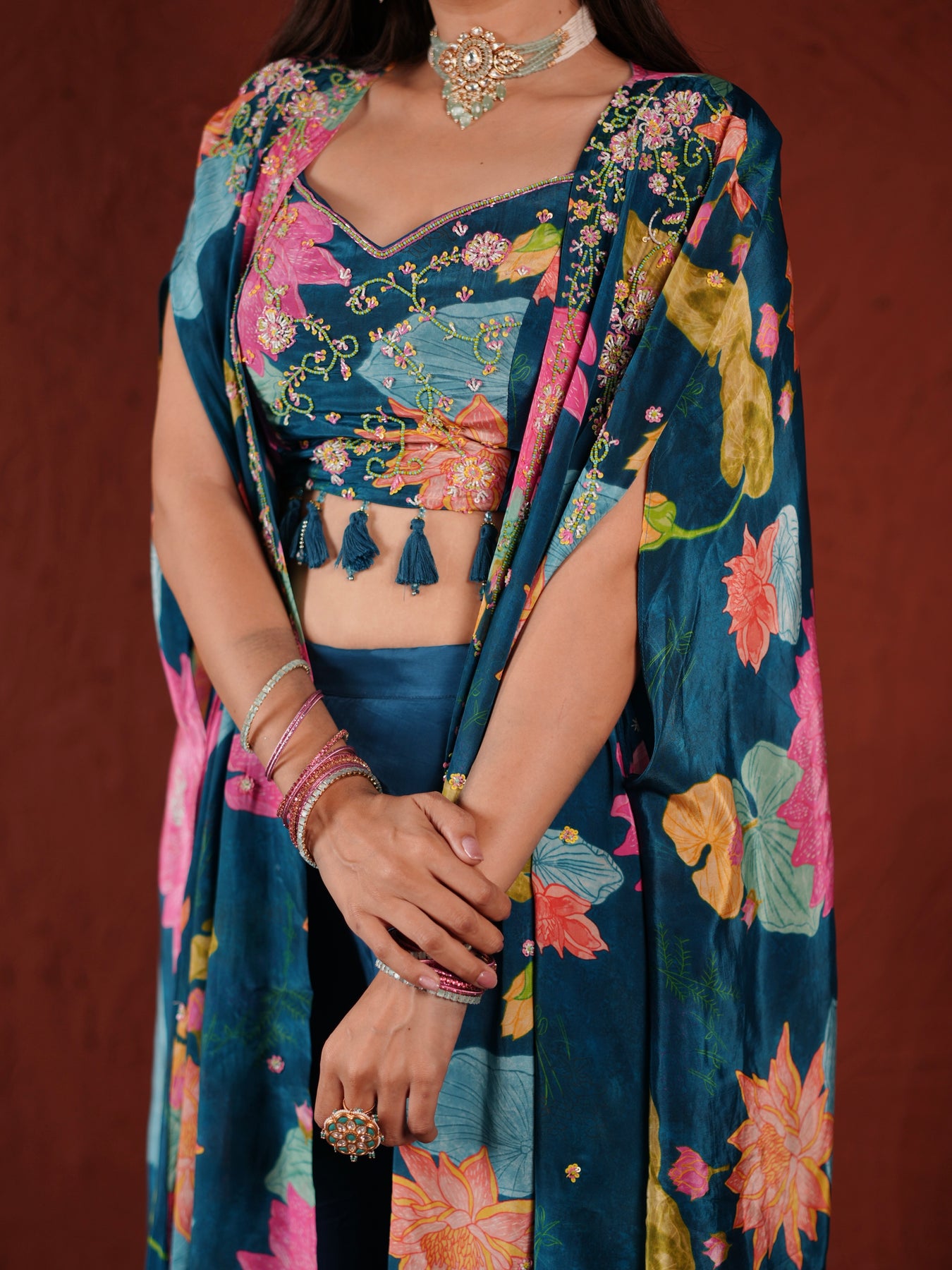 Paired with flowy palazzo pants and a vibrant floral-printed cape, this ensemble strikes the perfect balance between traditional grace and modern flair. The draped silhouette in soft satin georgette lends fluidity and elegance, making it ideal for sangeet nights, festive soirées, or destination celebrations.