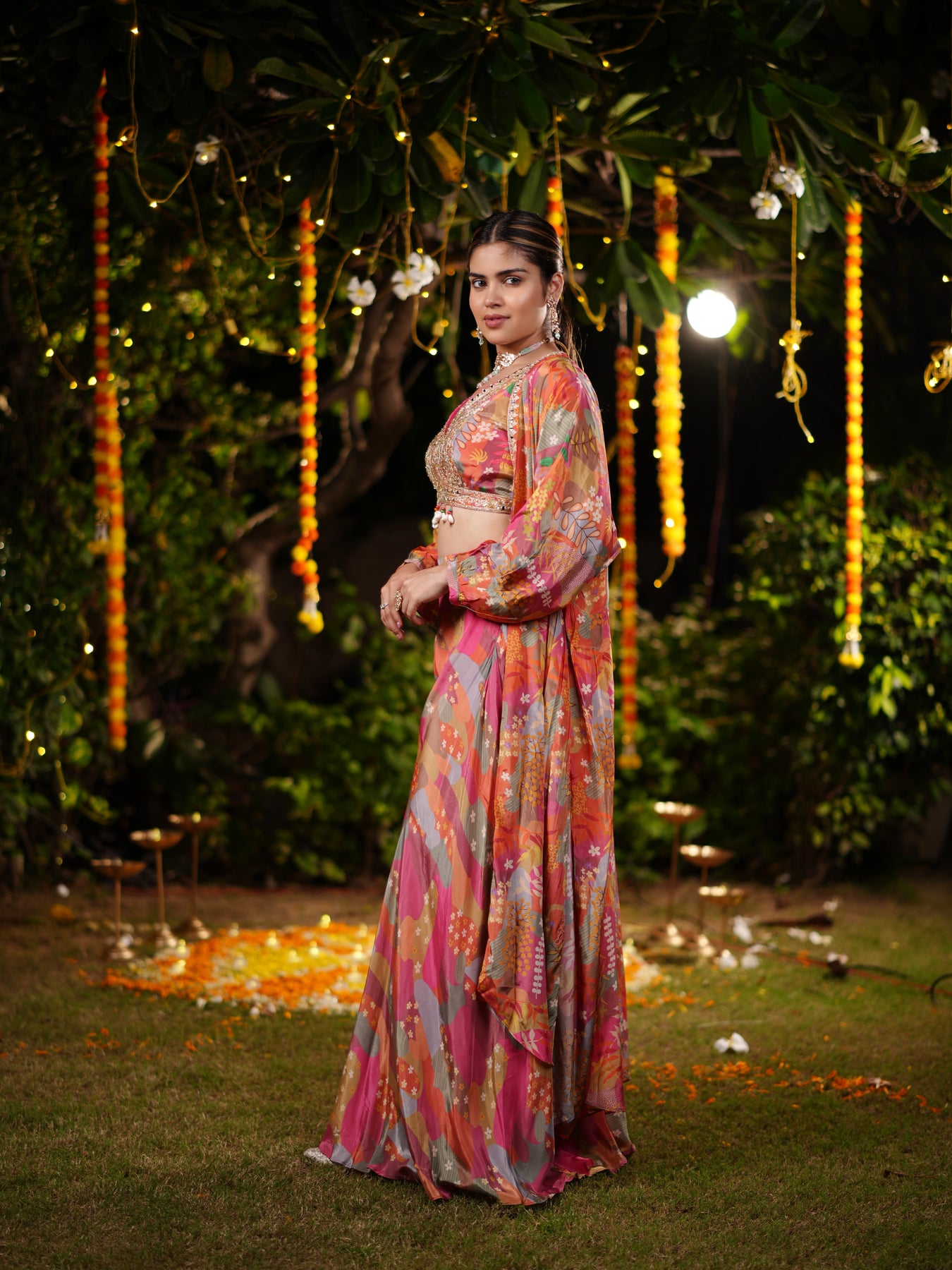 A vibrant printed chiffon cape drapes beautifully over the ensemble, showcasing a symphony of sunset-inspired hues in pink, coral, and gold with soft floral accents. Perfect for mehendi soirées, cocktail evenings, or festive gatherings, this Indo-Western look captures the perfect balance of color, charm, and couture sophistication.