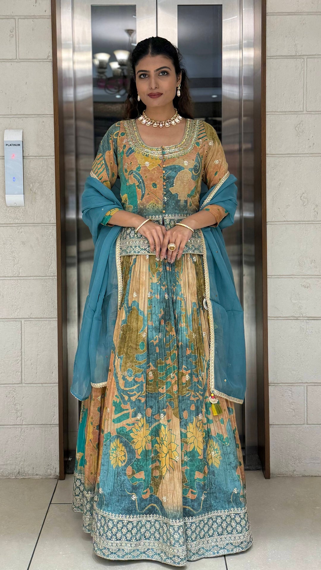 Teal Blue & Peach Printed Designer Peplum Lehenga Set with Flared Sleeves & Tassel Accents
