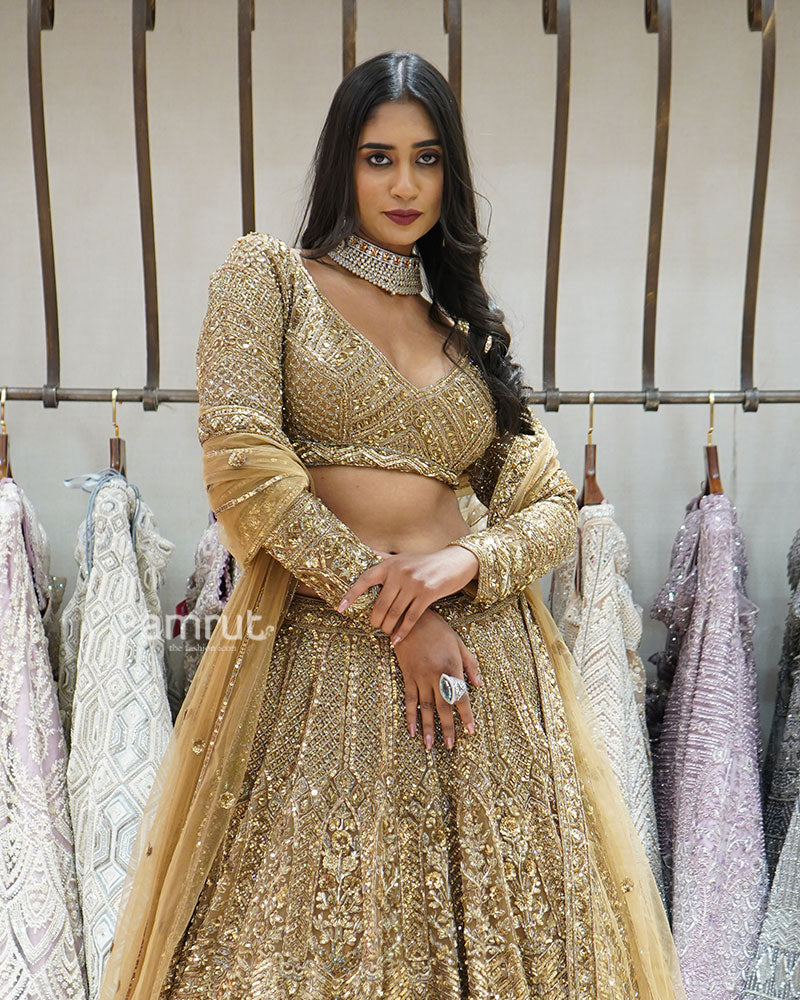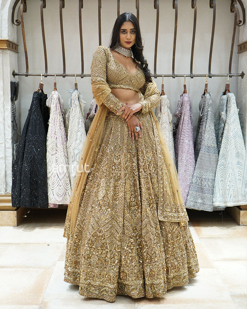 Dazzle in this golden bridal lehenga adorned with intricate mirror work, zari embroidery, and sequin detailing. The full-sleeved blouse with a sweetheart neckline adds regal charm, while the matching dupatta completes the look. Perfect for brides seeking opulence with timeless elegance.