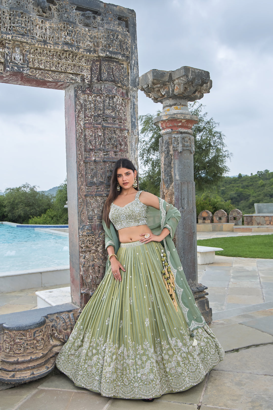 Color: Lehenga & Choli: Olive Green | Dupatta: Matching Olive Green