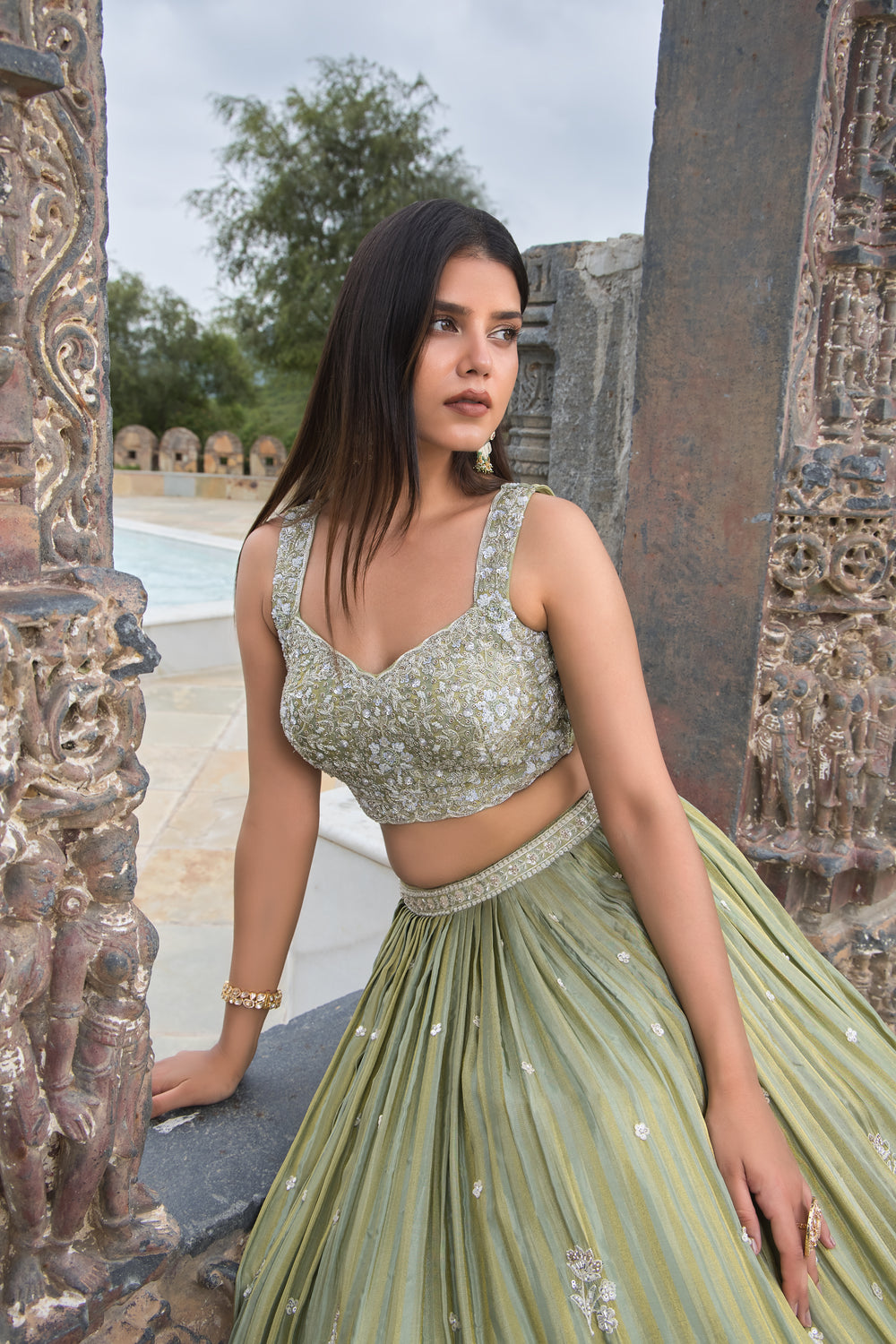 This sleeveless choli features a sweetheart neckline and is intricately adorned with silver embroidery, blending sequins, beads, and delicate threadwork for a rich, textured finish. The olive green lehenga showcases a full, flared silhouette with finely pleated panels, enhanced by elaborate floral embroidery along the hem and scattered embellishments throughout. Crafted in a luxurious fabric with a subtle sheen, the ensemble is designed to captivate with its graceful movement and timeless elegance. Paired with a matching dupatta, this look is perfect for weddings, festive celebrations, or any grand occasion.
