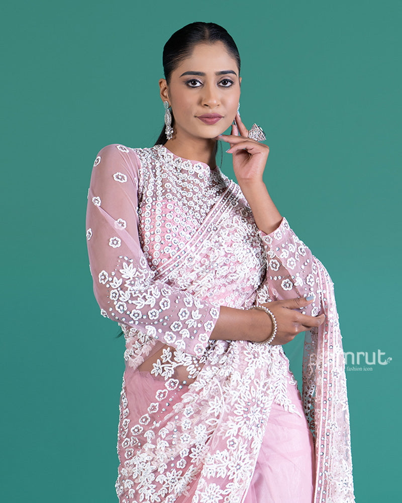 Light Pinkish-Rose Net Saree with White Embroidery and Beaded Long Sleeve Blouse