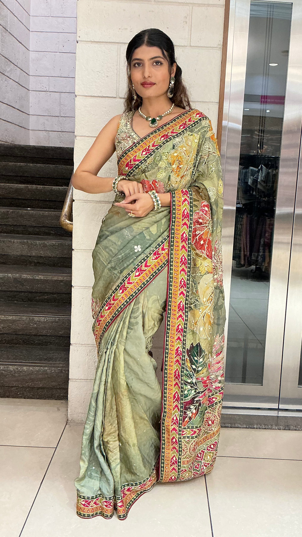 Sage Green Multicolour Floral Printed Designer Saree with Traditional Border