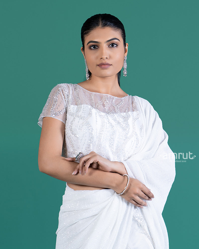 White with Sparkling Sequins Saree and Embellished Cropped Blouse
