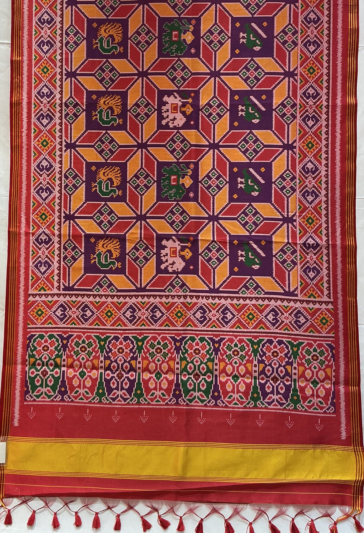 Celebrate timeless Gujarati craftsmanship with this stunning Patan Patan Patola-inspired saree in a rich royal purple base. The saree showcases bold geometric panels adorned with traditional Kunjar (elephant) and Mor (peacock) motifs — symbols of prosperity, strength, and grace.