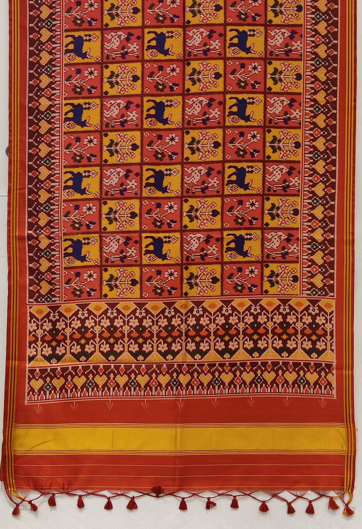 Red & Mustard Traditional Patola Inspired Silk Blend Saree with Folk Motifs P17