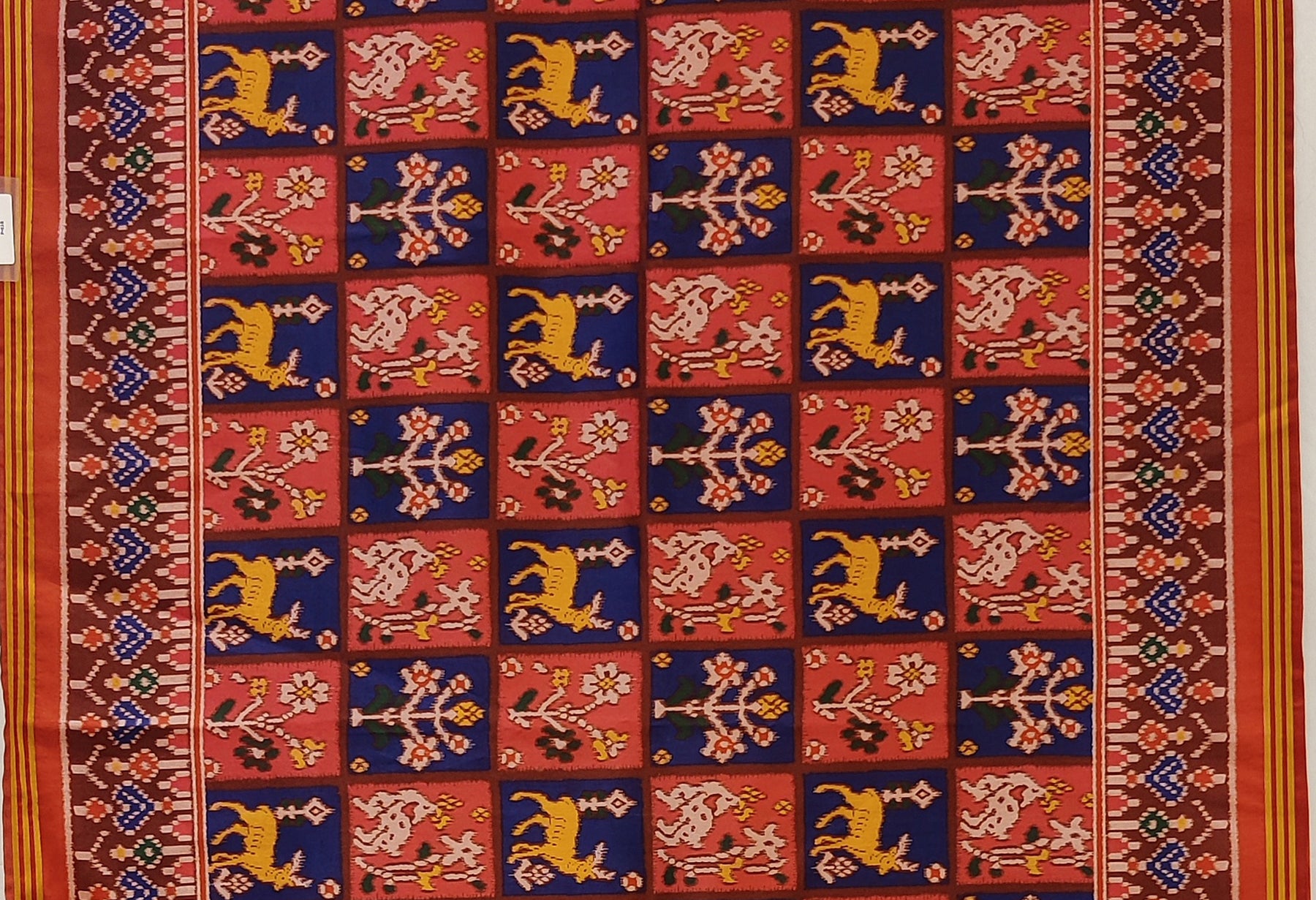 Experience the richness of Gujarati heritage with this striking Red & Royal Blue Patola Inspired Designer Saree. Crafted with traditional artistry, the saree features classic Patola-style square panels, beautifully decorated with folk animal, floral, and geometric motifs that reflect timeless cultural craftsmanship.