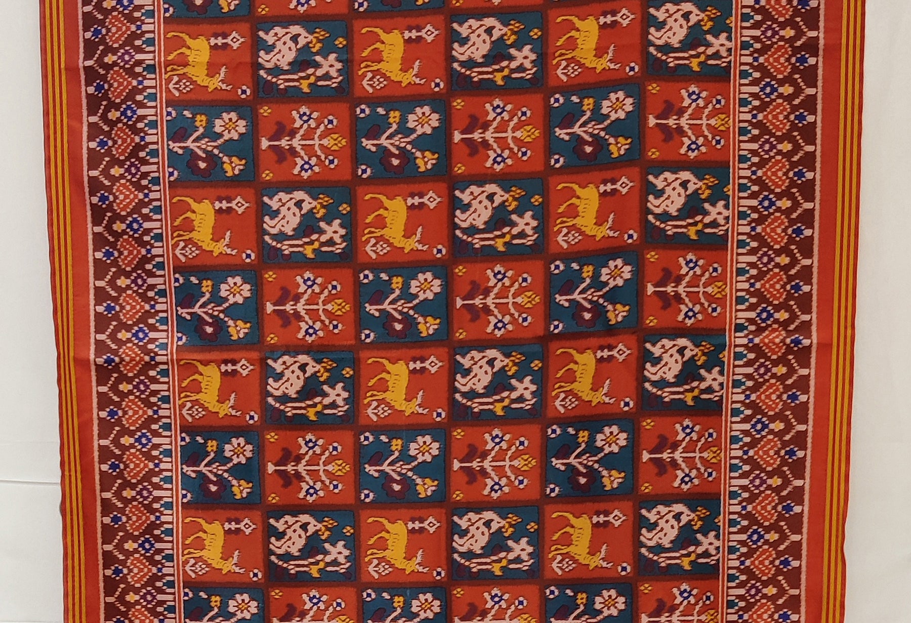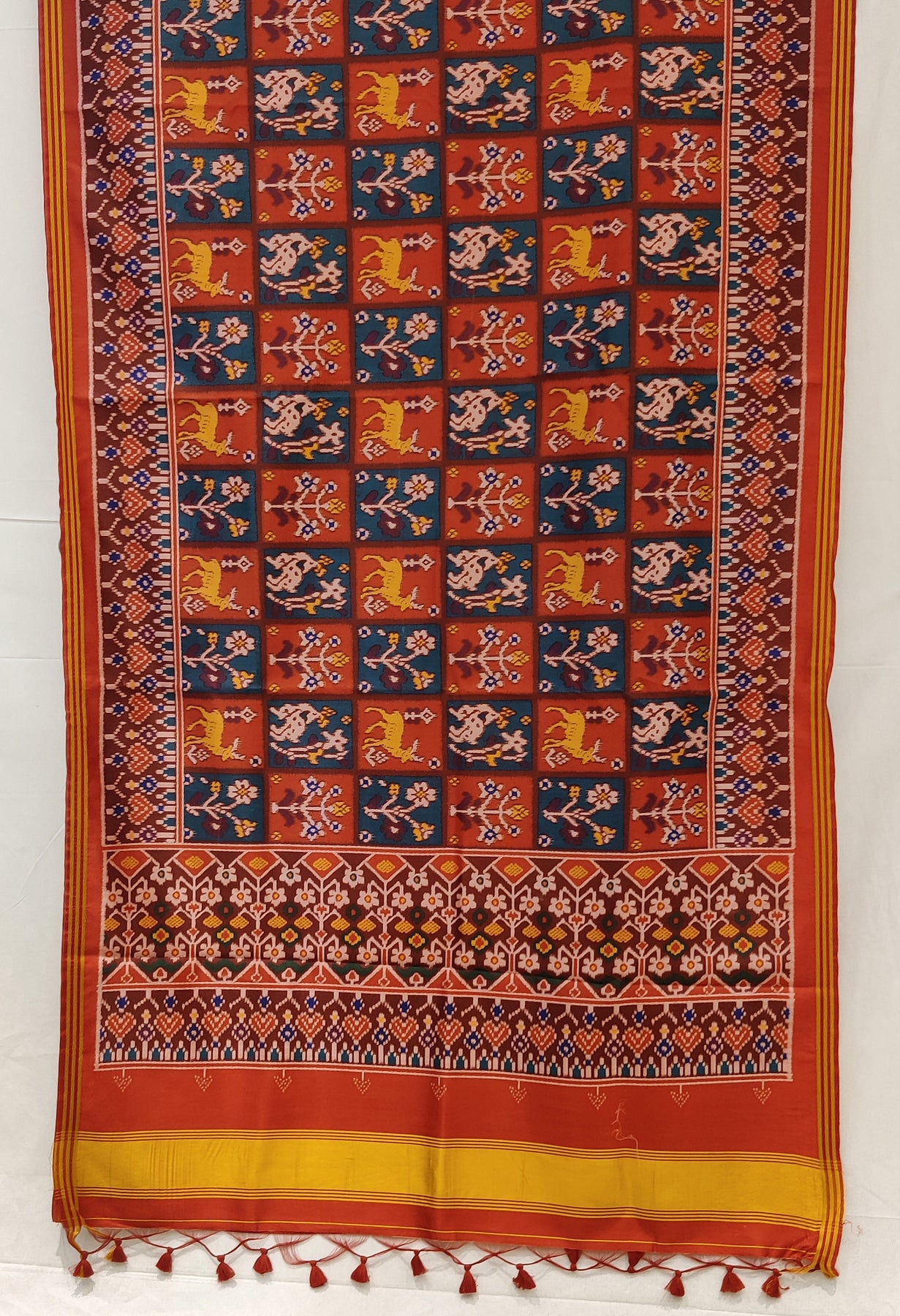 Celebrate India’s rich weaving heritage with this stunning Rust Red Patola Inspired Designer Saree, crafted to reflect timeless Gujarati craftsmanship. The saree showcases classic Patola-style geometric panels, adorned with traditional animal, floral, and folk motifs arranged in a striking grid pattern.