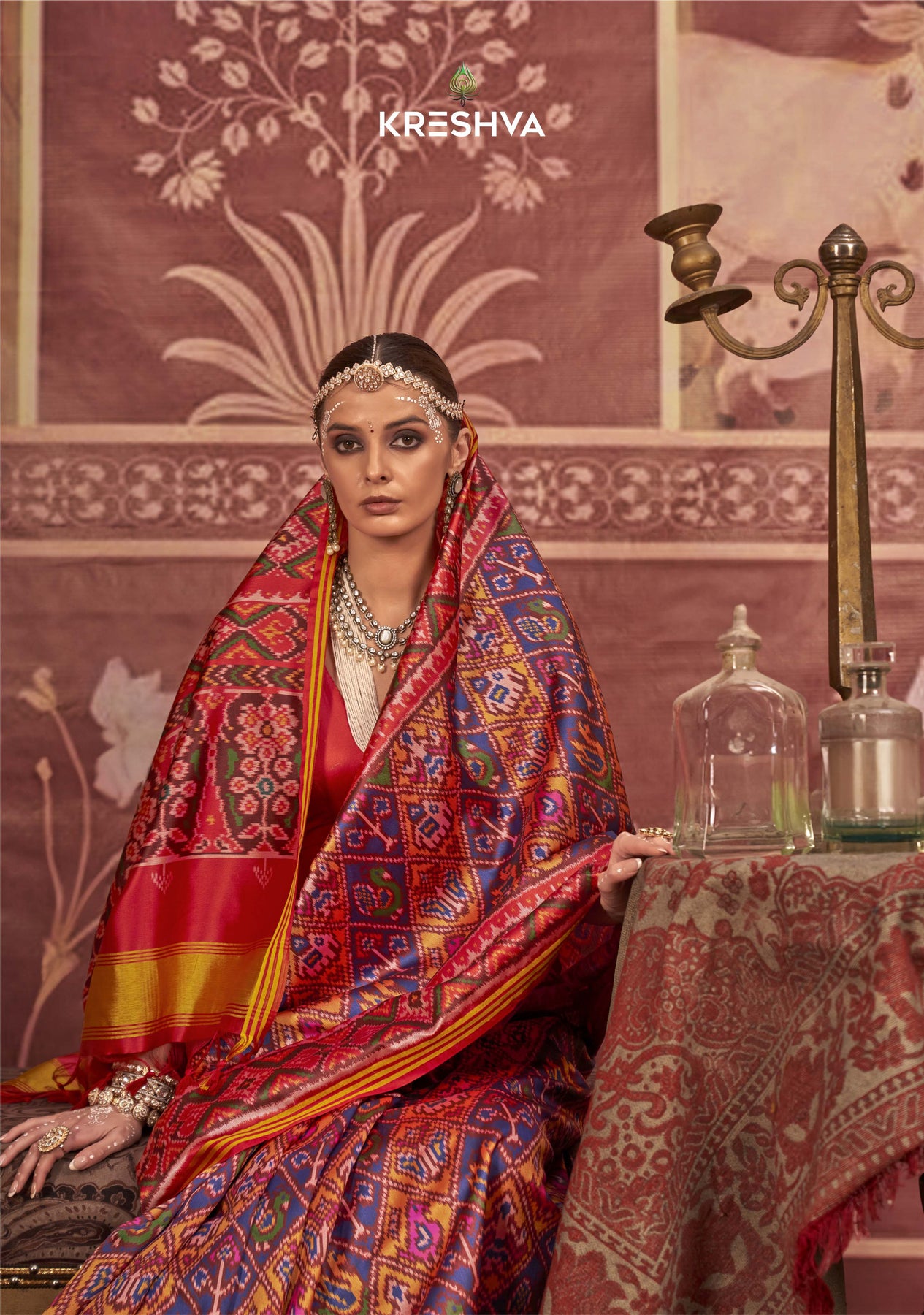 Step into the rich heritage of Gujarat with this Blue & Maroon Patan Patola Soft Silk Saree, a masterpiece inspired by the royal Patan weaving tradition. Featuring intricate multicolour ikat patterns, this saree beautifully blends cultural craftsmanship with contemporary elegance.