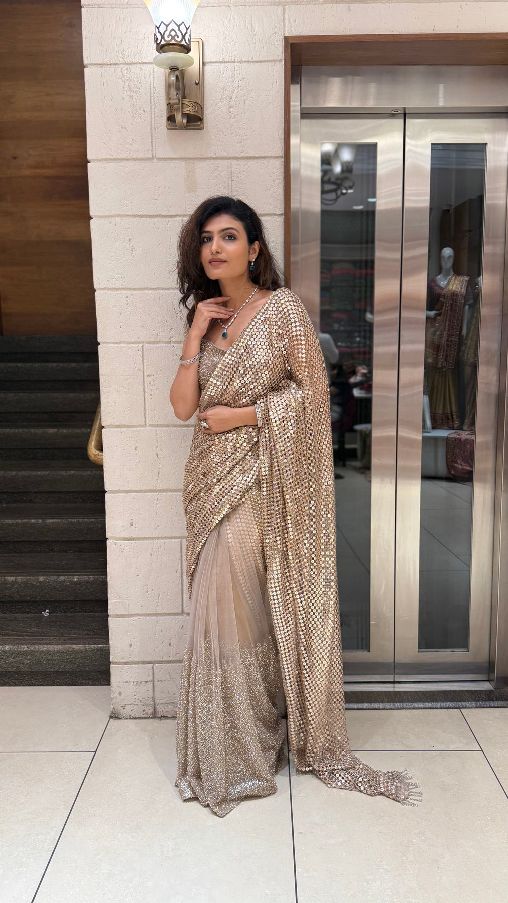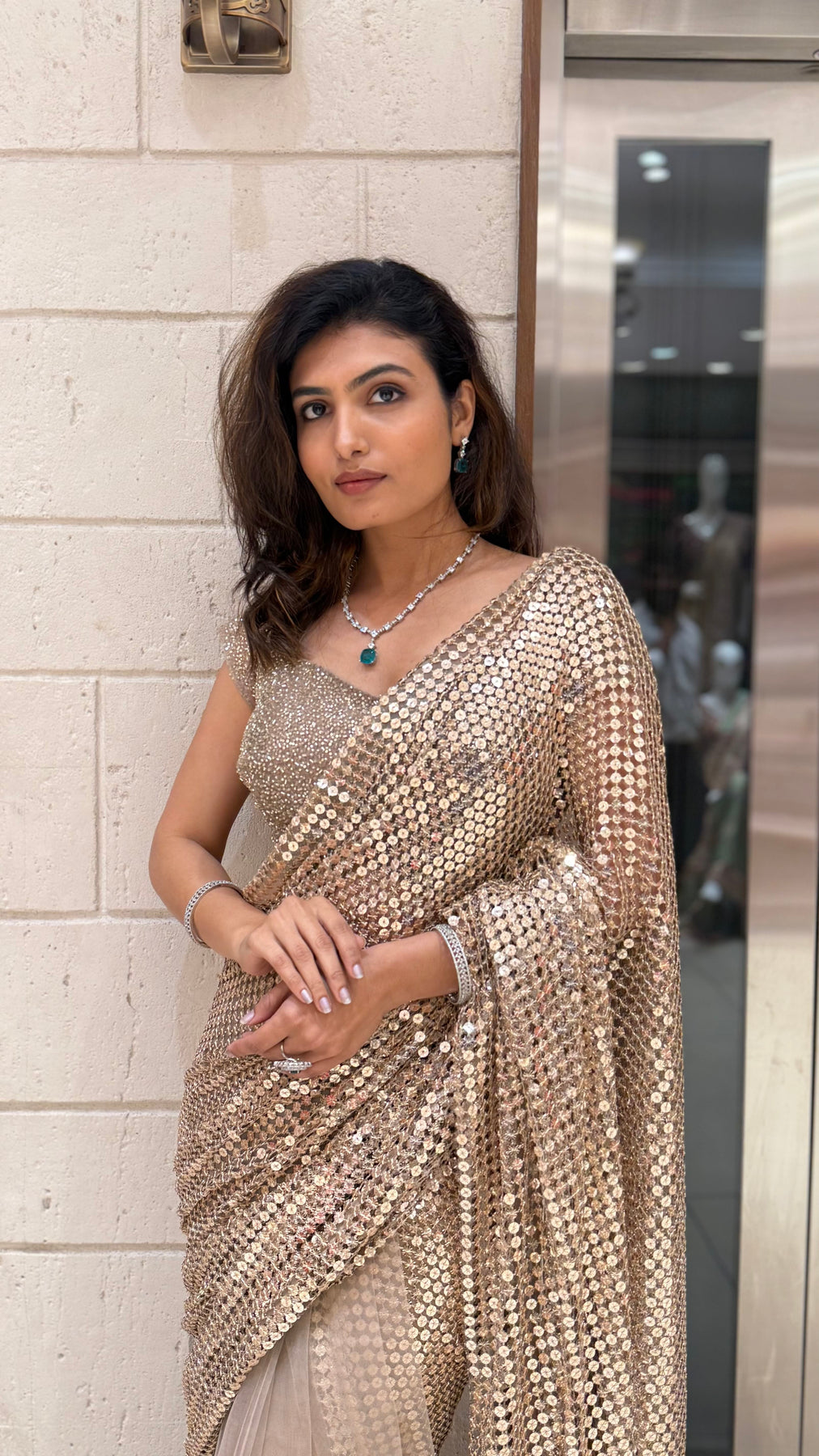 Turn every spotlight your way with this Champagne Gold Sequin Saree, a perfect blend of shimmer, elegance and celebrity-inspired glam. Fully embellished with reflective statement sequins on the drape and a soft mesh pallu, this saree delivers a red-carpet look with effortless flow.