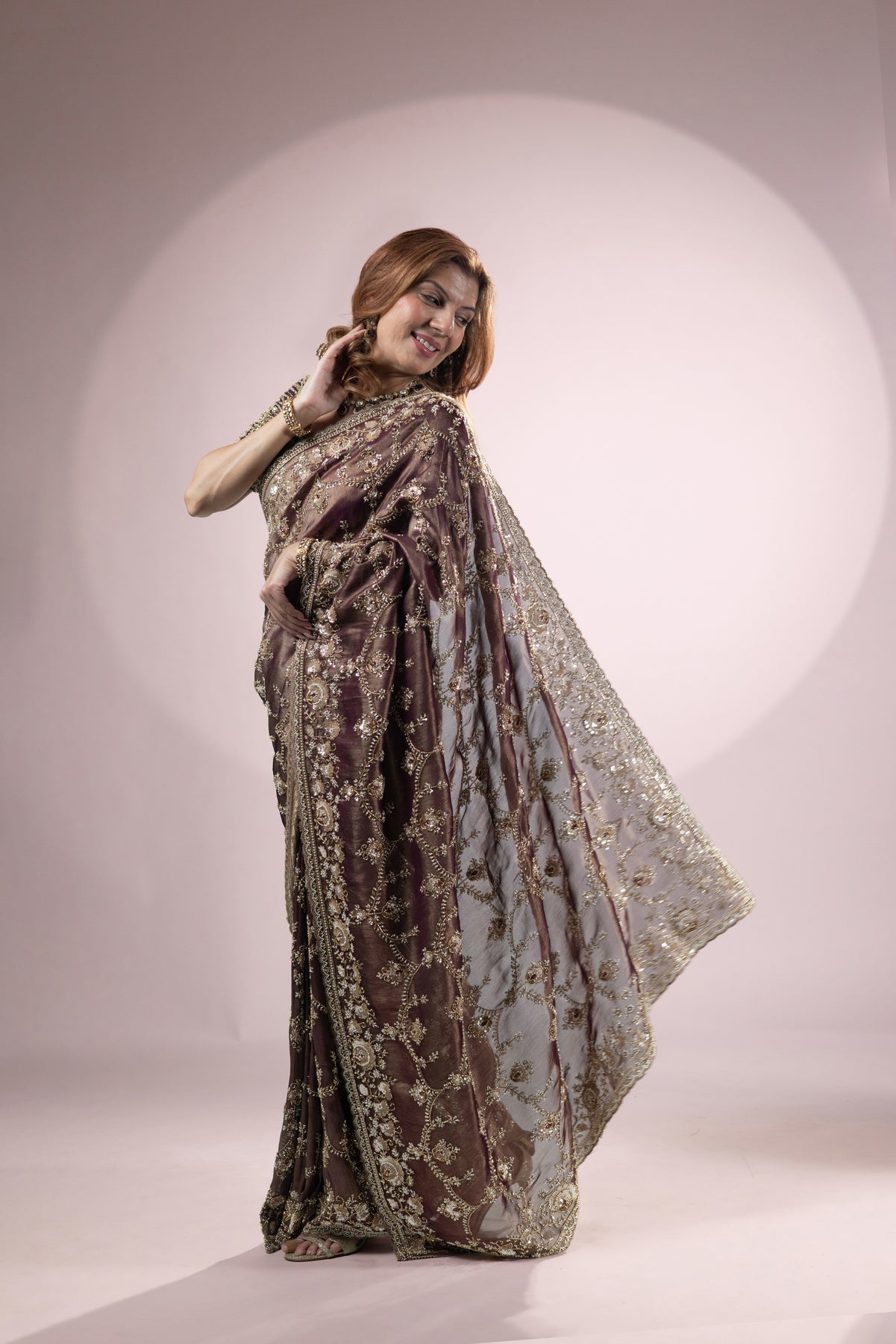 The deep brown tone combined with shimmering embroidery adds depth and richness to the outfit, while the luxurious silk fabric drapes gracefully for a flattering silhouette. Paired with a matching embroidered blouse, this ensemble is perfect for making a statement at grand celebrations.