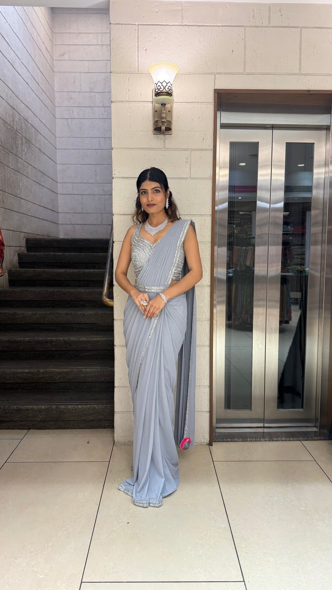 The luxurious silk fabric drapes beautifully, enhancing the elegance of the silhouette while the ornate embroidery adds depth and sophistication. Paired with a beautifully embellished blouse, this ensemble reflects refined craftsmanship and timeless charm.