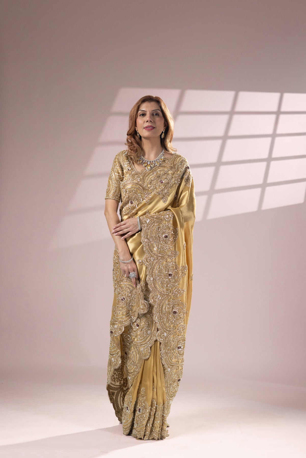 Exude timeless luxury with this stunning golden designer silk saree, crafted to make a statement at grand occasions. The saree features intricate all-over embroidery with delicate zari, sequins, and beadwork, creating a rich and regal aesthetic.