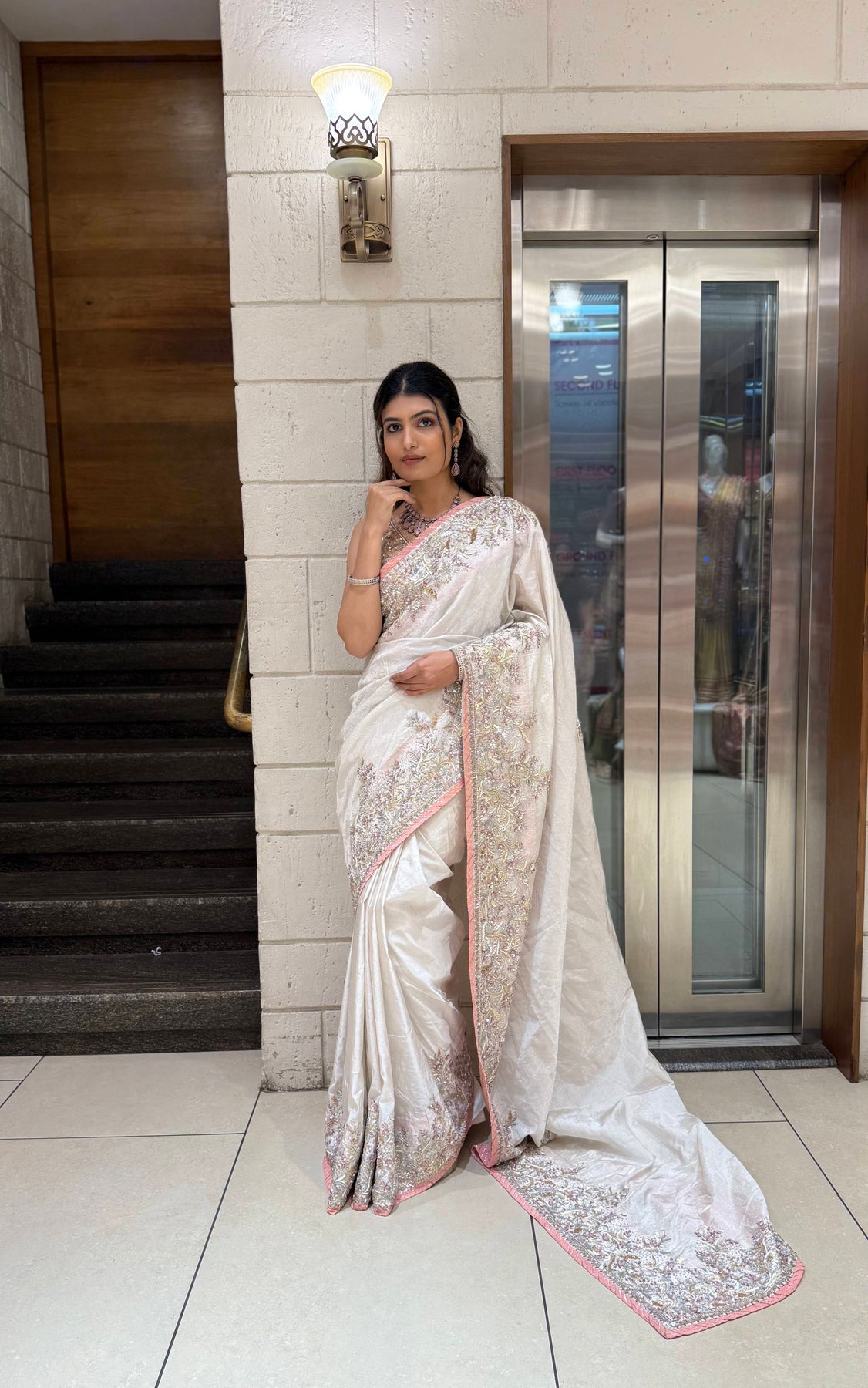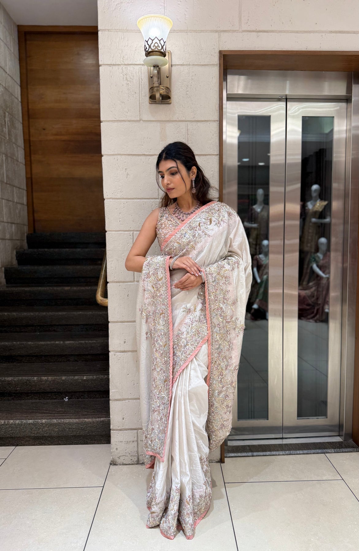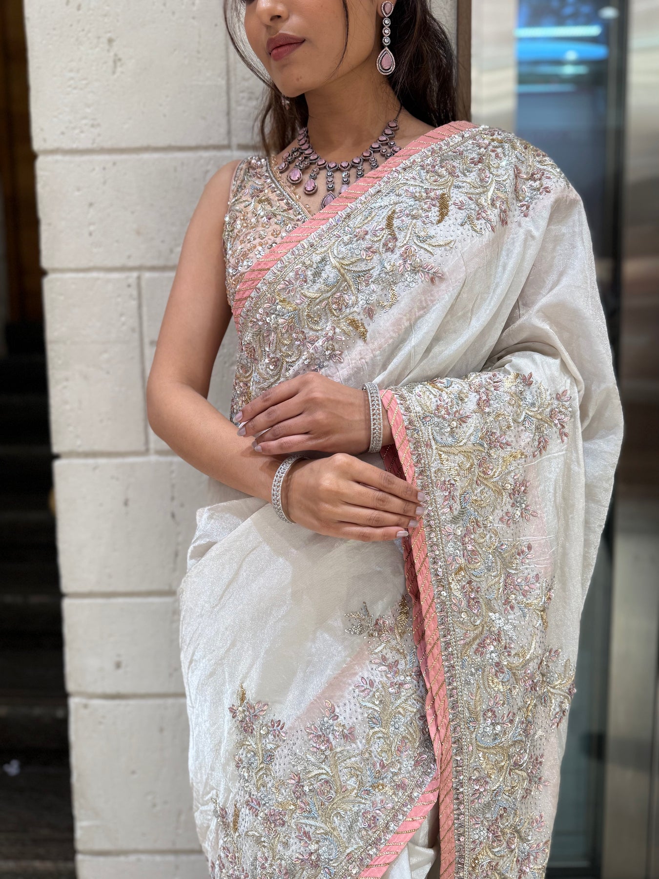 Ivory Hand-Embroidered Tissue Silk Saree with Pastel Thread & Sequin Work