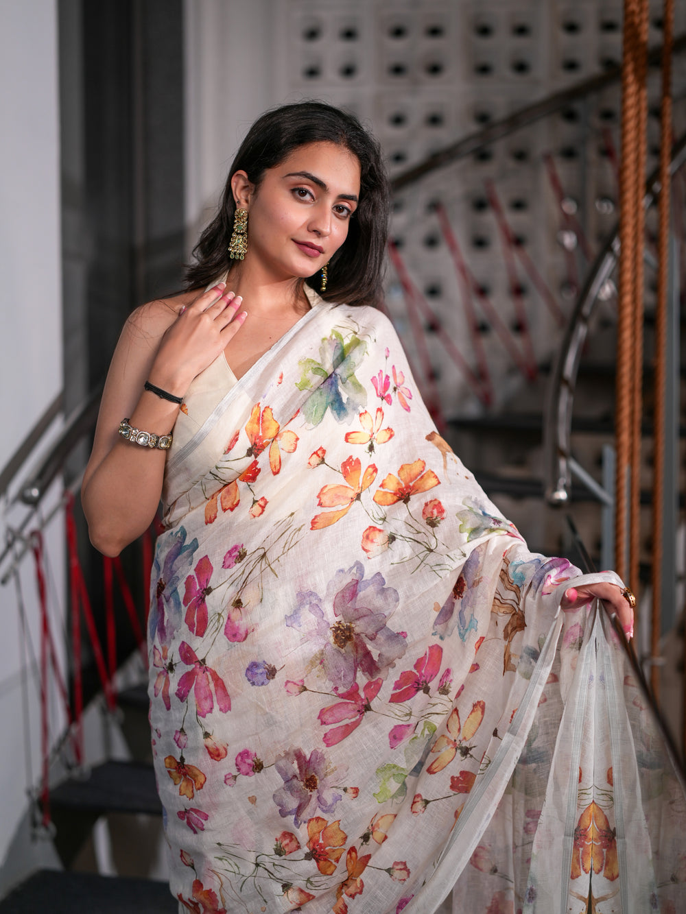 Elegant White Linen Saree with Vibrant Floral Watercolor Print Unstitched Blouse