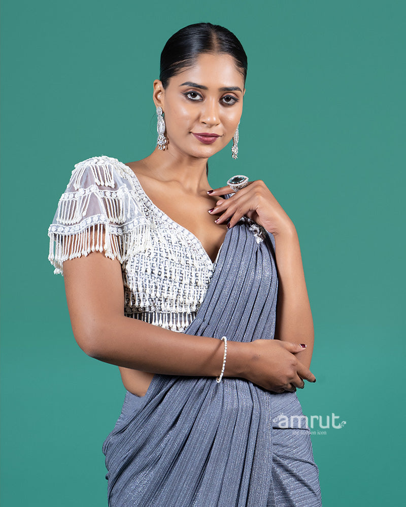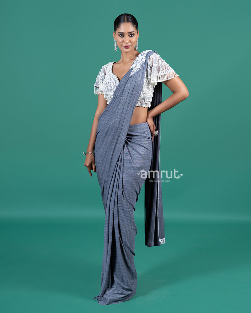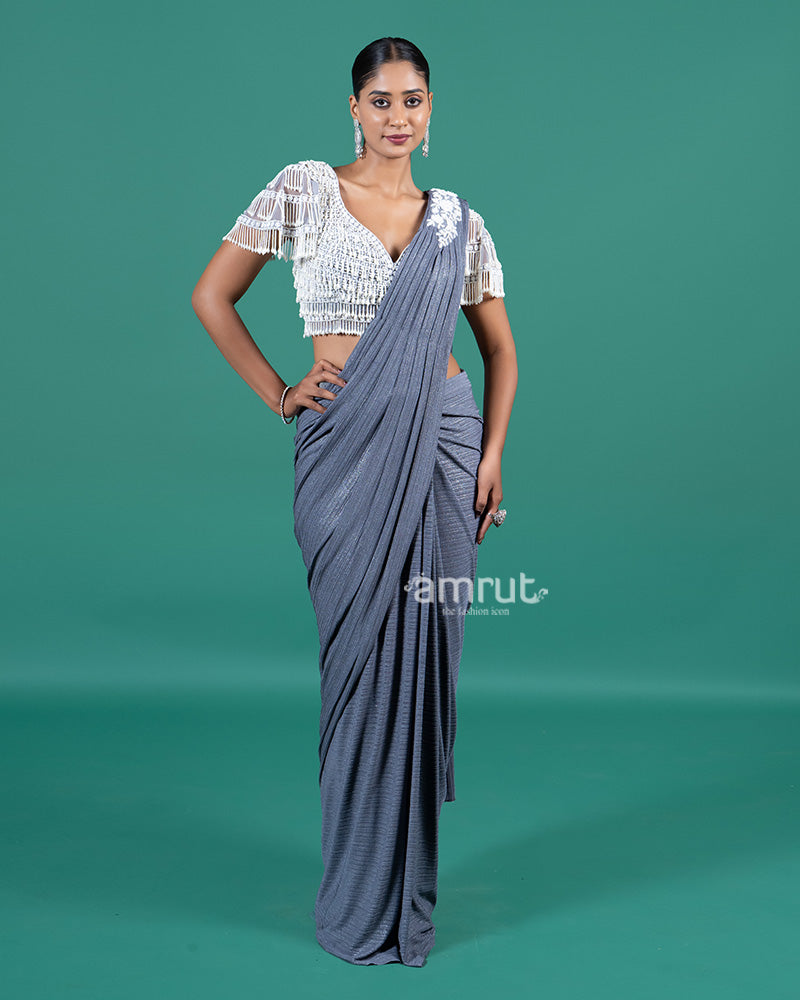 Gray Ready-to-Wear Saree with Beaded Embellished Blouse