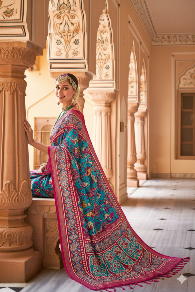 This exquisite Purple and Teal Patola Print Silk Saree is a magnificent example of traditional Indian craftsmanship. Woven using the renowned double ikat technique, the saree showcases a beautiful blend of vibrant purple and soothing teal hues. The intricate geometric and floral motifs on the fabric exemplify the seamless fusion of heritage and contemporary design.