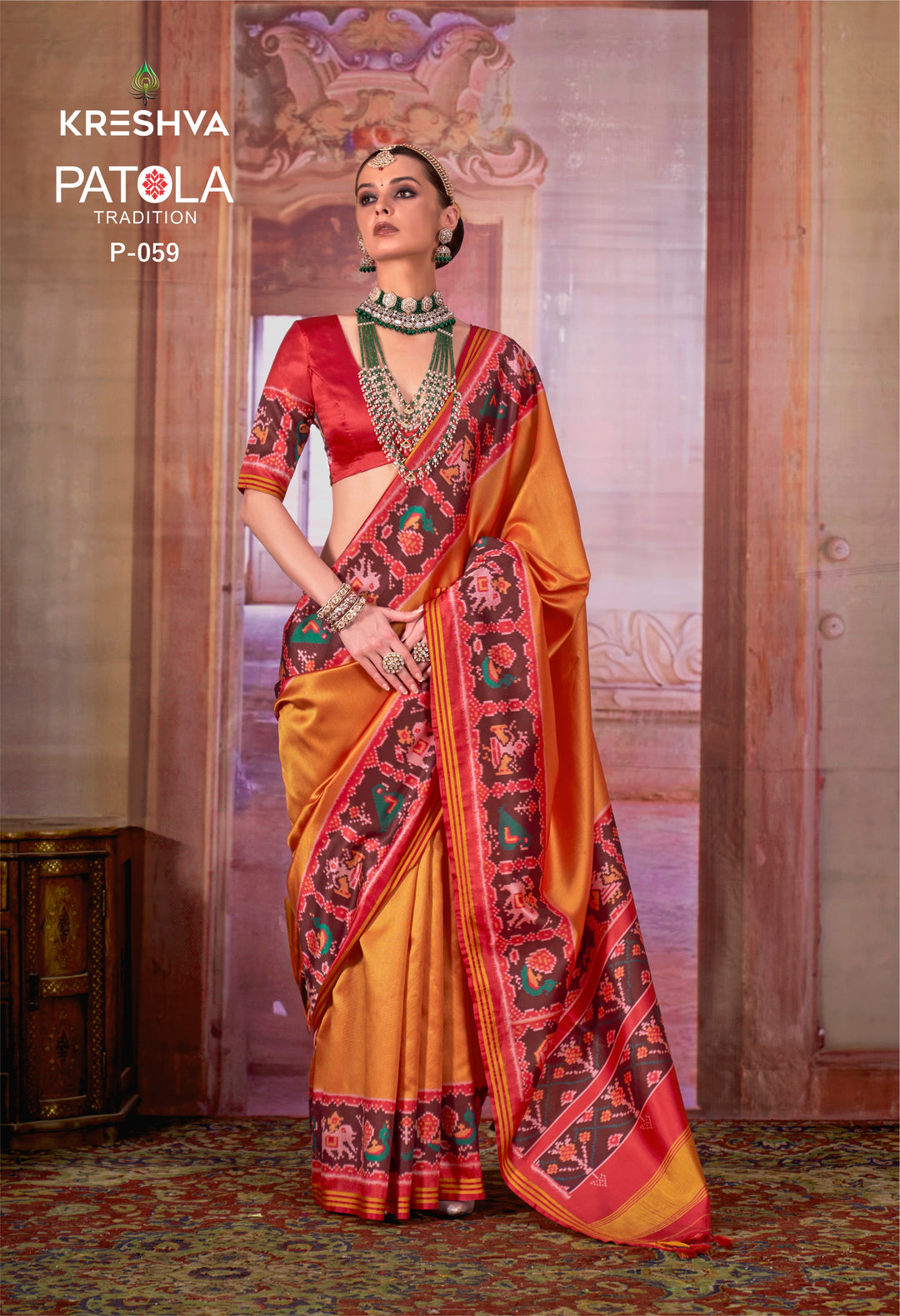 Mustard Gold & Red Patola Soft Silk Saree with Traditional Ikat Border & Pallu