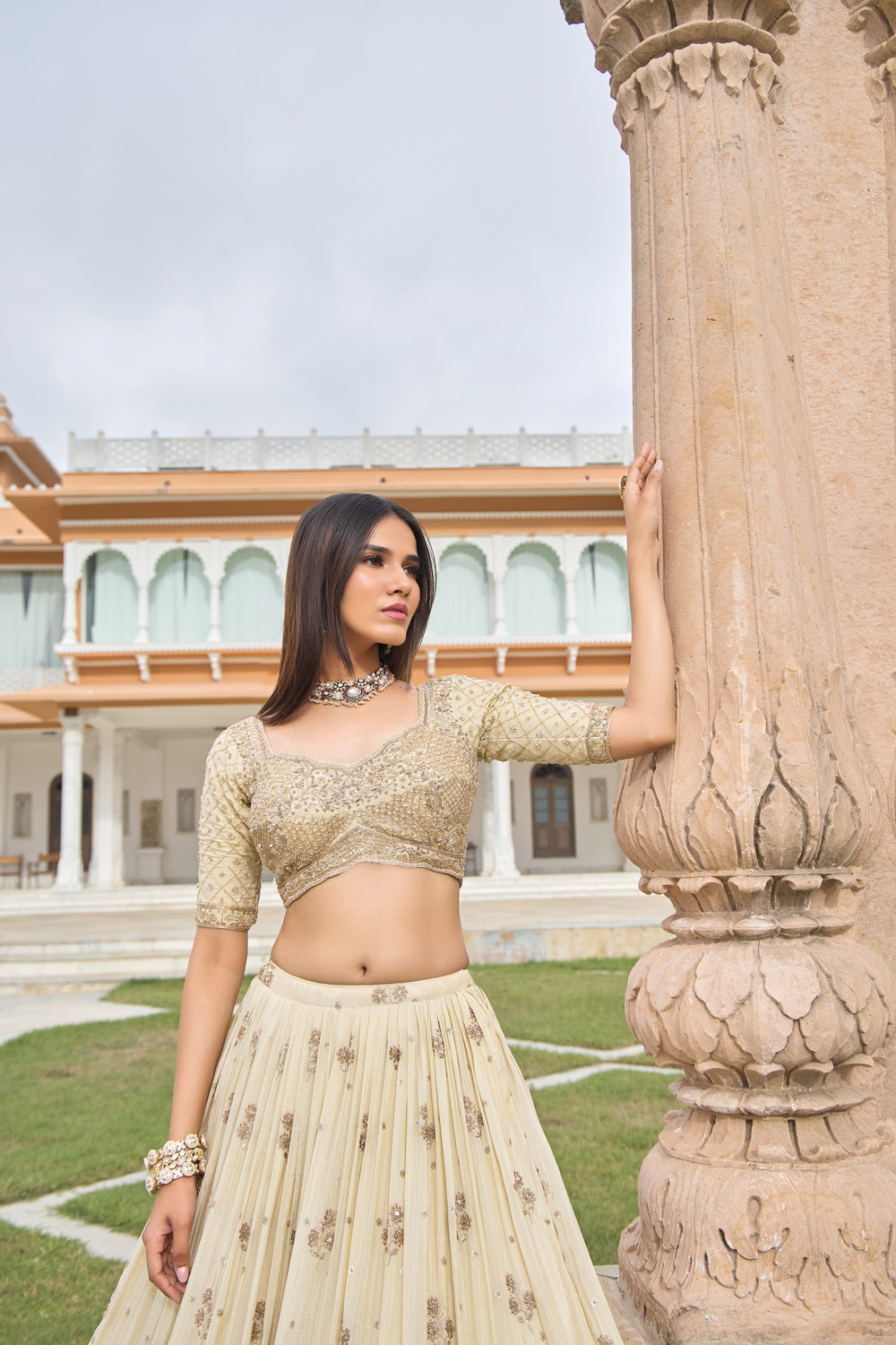 Color: Lehenga & Choli: Champagne Beige | Dupatta: Matching Golden Beige