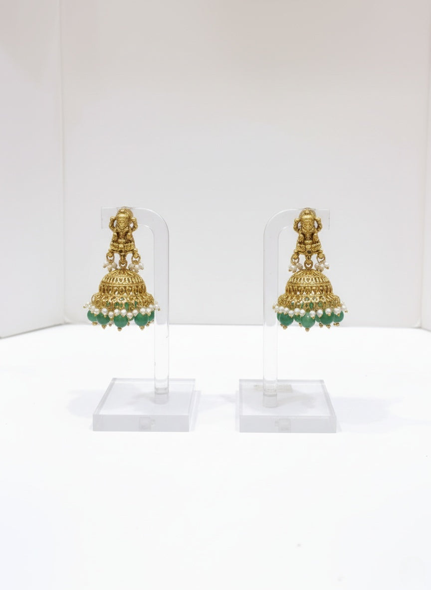 This grand temple jewelry set exudes divine elegance, featuring a multi-strand green bead necklace with intricately designed gold motifs. The centerpiece pendant showcases a beautifully sculpted Goddess Lakshmi seated on a lotus, flanked by peacocks and adorned with ruby and emerald accents. Delicate pearl and green gemstone drops enhance the richness of the design. The matching jhumka earrings mirror the deity motif, embellished with tiny pearls and green bead hangings, creating a harmonious traditional look. Perfect for weddings, cultural rituals, and festive celebrations, this set symbolizes prosperity and timeless heritage.