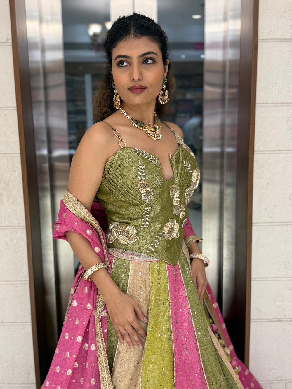 Brown Pleated Lehenga Choli with Intricate Embroidery and Matching Dupatta