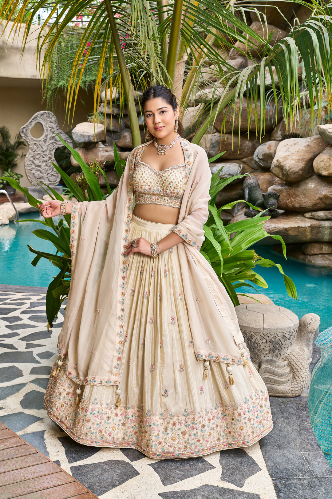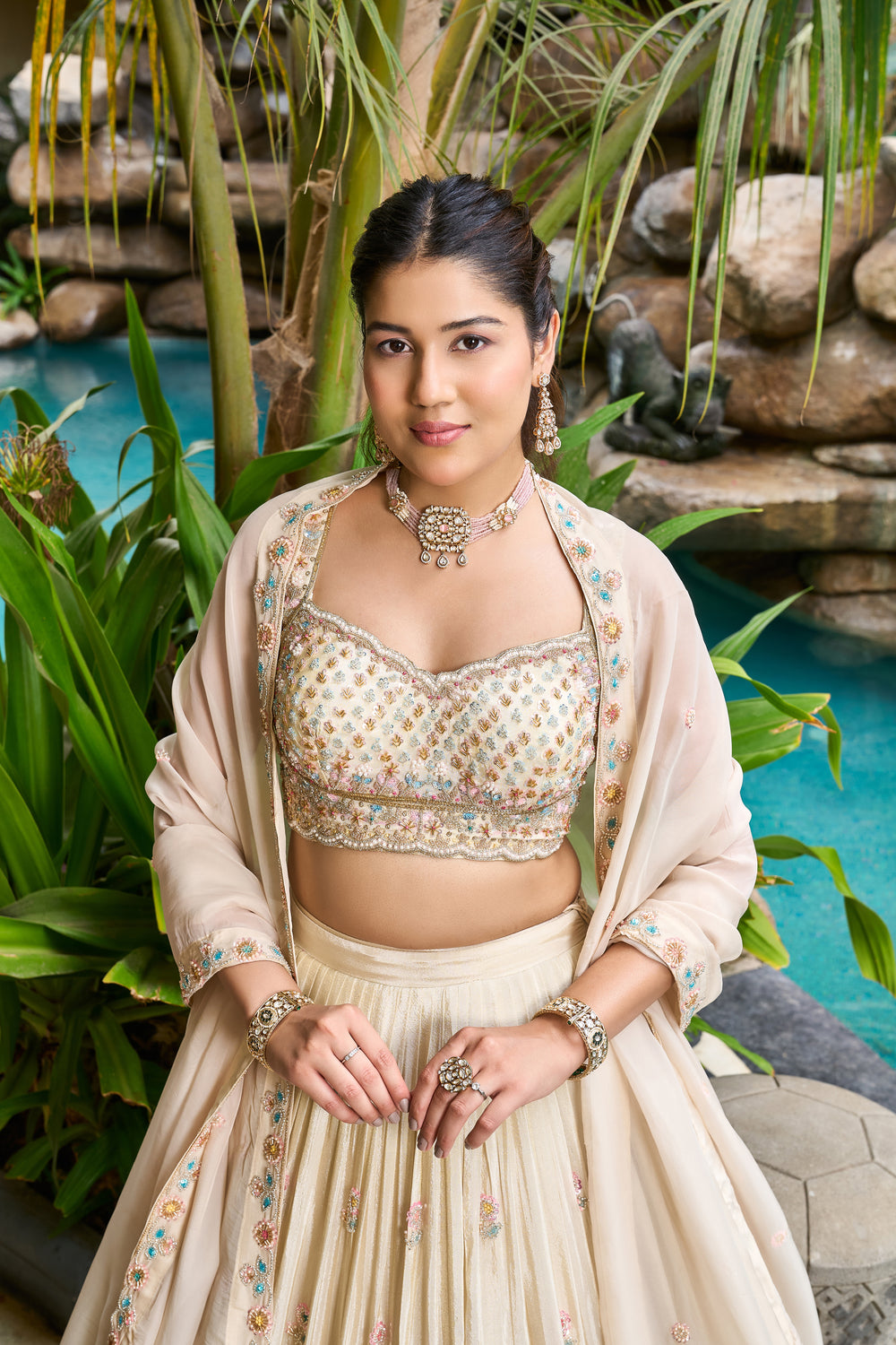 This ready-to-wear cream-colored pleated saree features decorative ruffles and frills along the edges, with beaded trim accenting the pleats for a layered, flowing look. The matching cream blouse is adorned with delicate embroidery, long sleeves, and a square neckline, enhancing the ensemble's elegance. Perfect for a sophisticated, graceful appearance.