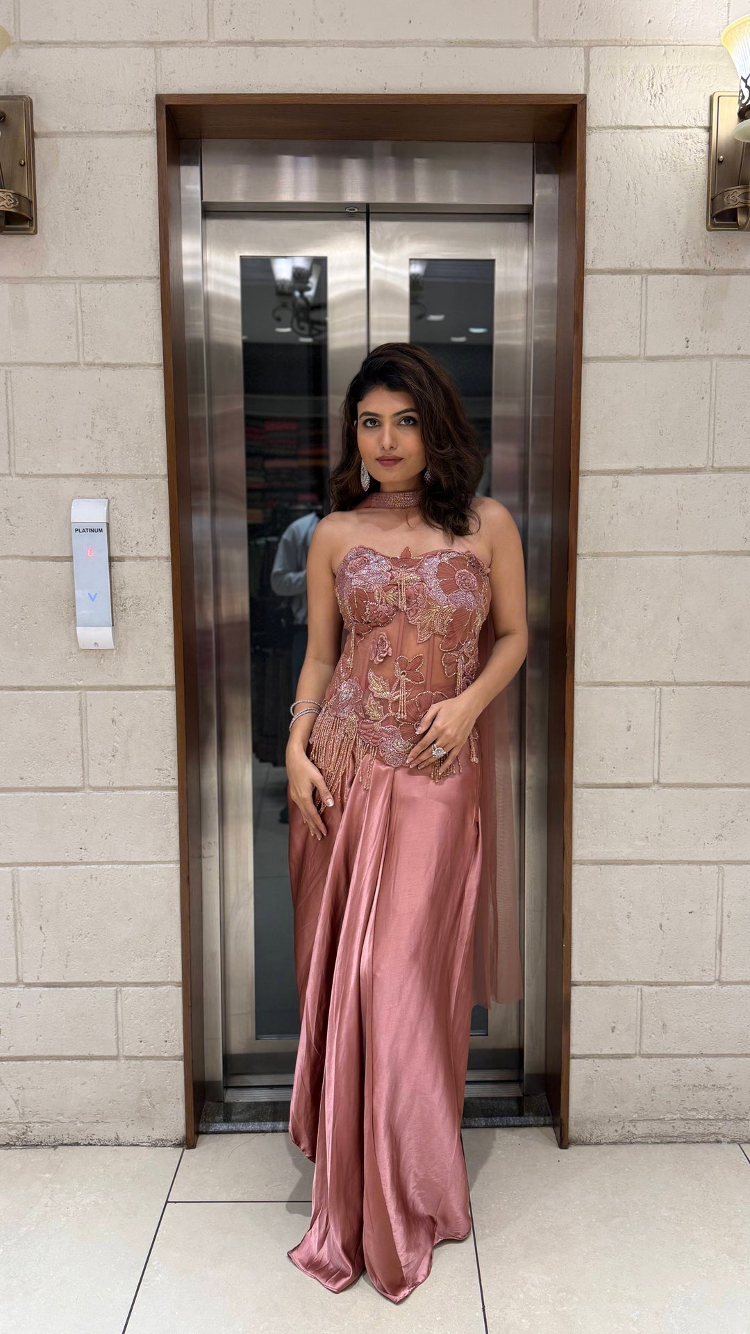 This dusty rose lehenga features a shimmering fabric with intricate gold and bronze embellishments scattered across the skirt and bodice. The full, tiered skirt flows outward in soft waves, complemented by a matching choli with subtle details. A sheer, light peach dupatta drapes elegantly over the ensemble, adding a delicate touch