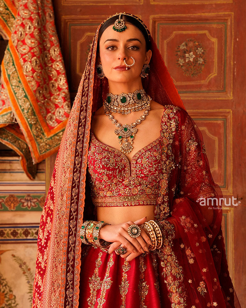 This maroon-red lehenga is beautifully embroidered with intricate gold thread and sequins, extending from the waist to the hem. The deep maroon-red choli features matching dense embroidery, creating an elegant, detailed look. A coordinating dupatta with gold embroidery completes the ensemble, adding a graceful finish.
