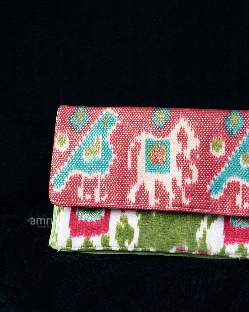 Elevate your accessory game with this handcrafted fabric wallet, blending rose-pink and olive green ikat patterns in a unique layered design. Featuring stylized animal motifs and vibrant accents of teal, cream, and gold, it’s a perfect fusion of tradition and artistry. Ideal for ethnic ensembles and everyday elegance.